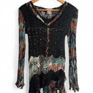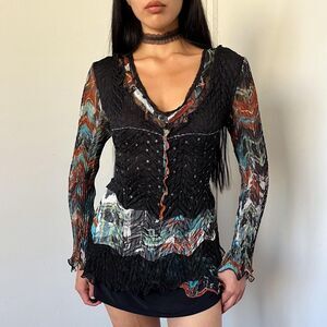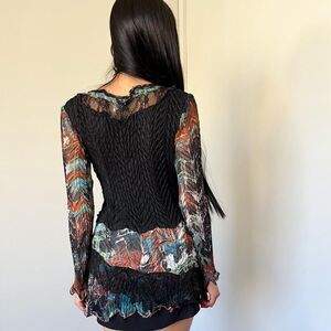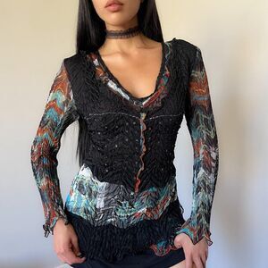 Sheer mesh long sleeve top with ruffle details and abstract print