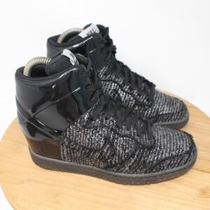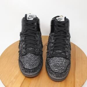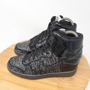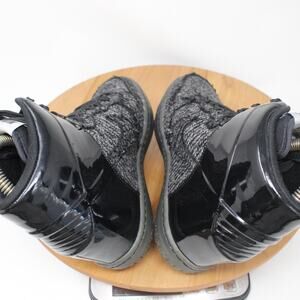Features a unique black and gray tweed textile upper with glossy black patent leather overlays for a bold textural contrast.