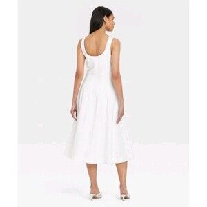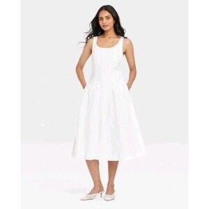 The A New Day Women's Corset Midi A-Line Dress in white is a versatile and stylish piece perfect for various occasions. Made of a comfortable blend of Rayon and Cotton, this dress features a flattering U-line neckline and a side zip closure for easy wear. With 10 pockets, this dress is both practical and chic, making it a great choice for travel, weddings, parties, or even casual outings. The elegant design and classic theme make it a timeless addition to any woman's wardrobe, perfect for the glam, travel, or preppy look.