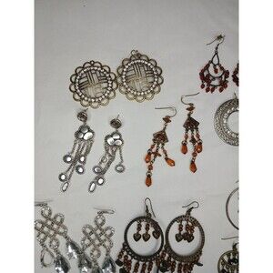 This lot of 12 statement chandelier earrings from the 80's and 90's features a boho, gypsy, and peasant glam style. Beaded with brown orange glass, these earrings have a hook closure and a length of 2-4 inches. The retro design is perfect for women looking to add a touch of beauty and uniqueness to their outfits. Antique in style, these earrings exude a bohemian vibe and are sure to make a statement.