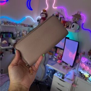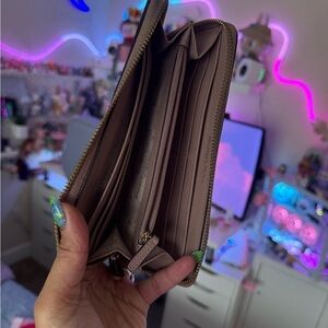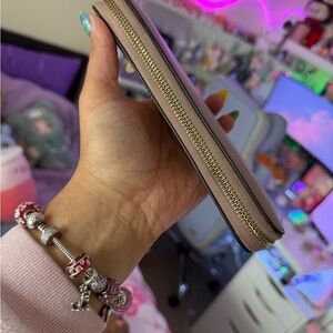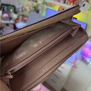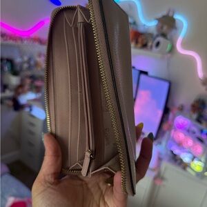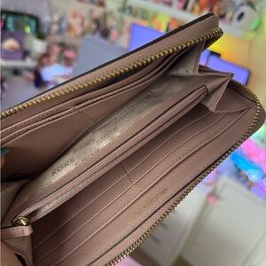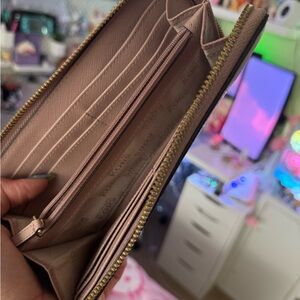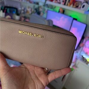 Elegant Michael Kors wallet in mauve leather. Features gold logo and zip closure.