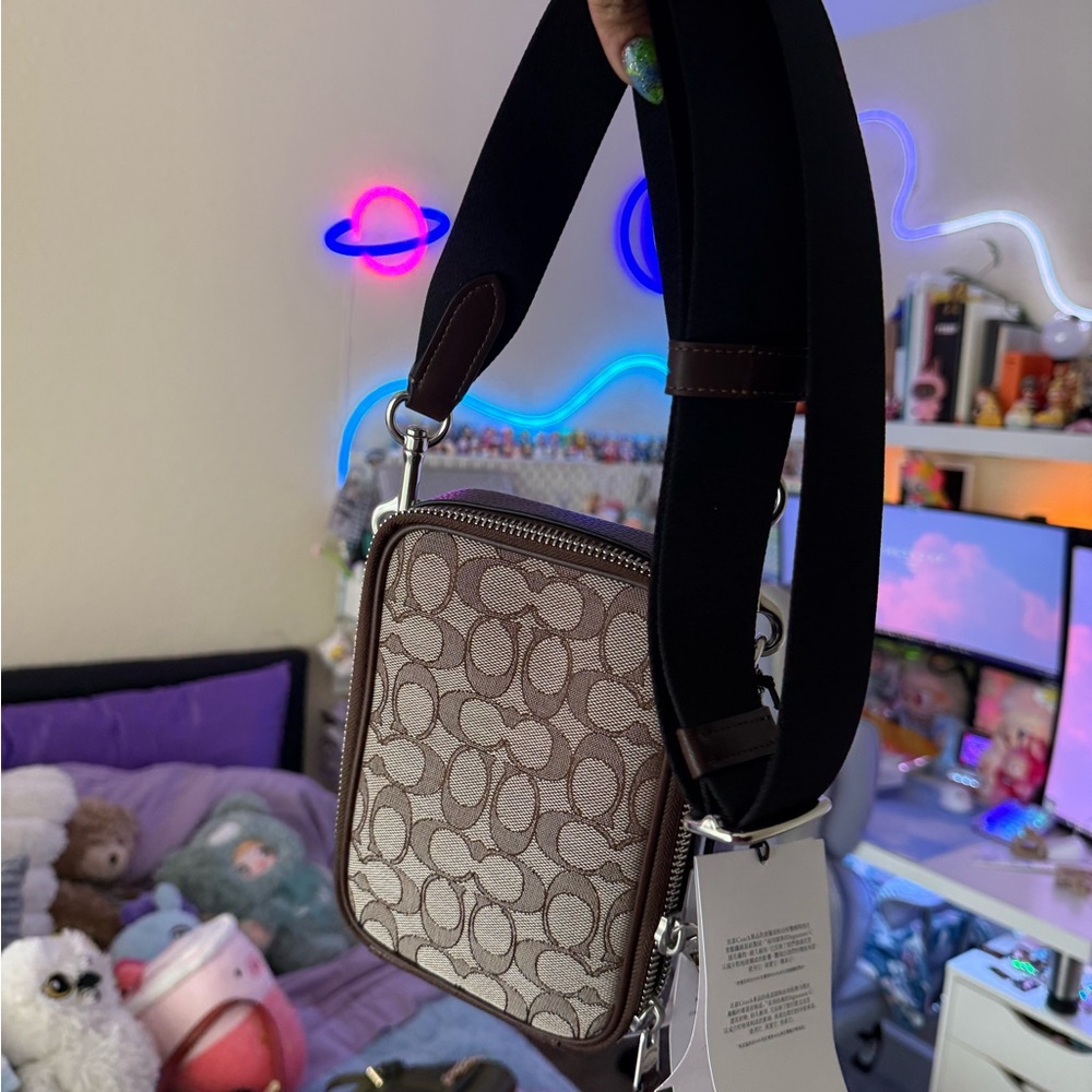Elegant Coach shoulder bag with iconic pattern. Features rich brown and cream tones. Perfect for everyday use.