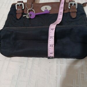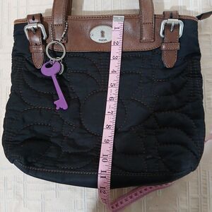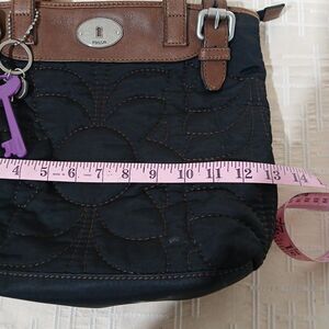 The Fossil Quilted Shoulder Bag in Black Brown is a classic and stylish handbag perfect for casual, business, or travel occasions. Made of leather with a beautiful floral pattern and a zip closure, it features double brown handles and a green fabric lining. This tote handbag has a spacious interior with inner pockets and a mobile phone pocket, making it both fashionable and functional. The quilted finish adds a touch of sophistication to this timeless piece from the Fossil brand.