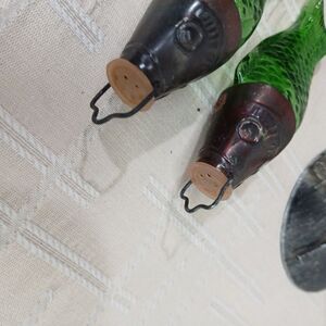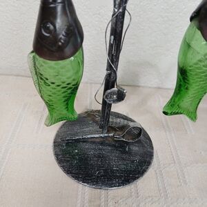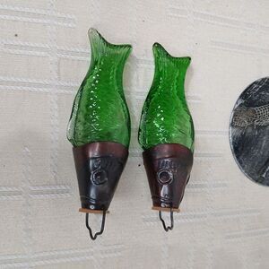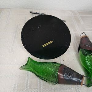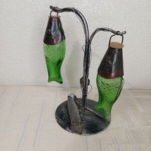 This vintage set of fish-shaped salt and pepper shakers with a metal stand holder is a charming collectible from the 1960s. Made in Hong Kong, the shakers feature a green glass body and plastic stopper, adding a unique touch to any kitchen or dining table. The handmade design and retro style make it a fun and functional addition to any collection of kitchen tools and gadgets.