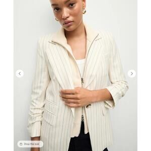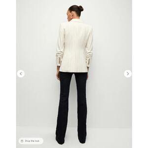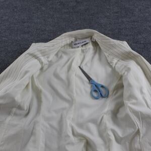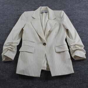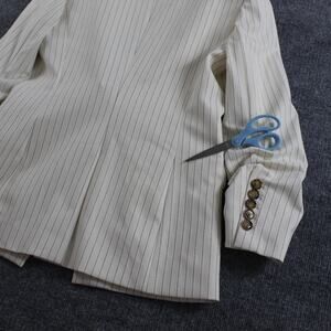 Features: Sophisticated tailored blazer with notched lapel, single front button closure, flap front pockets, full inner lining, and classic pinstripe pattern. Decorative four-button cuffs at sleeves. Single vent at back hem.