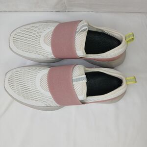 The Sorel Kinetic Impact Pink Strap Slip On Athletic Sneakers in size 8.5 for women are a stylish and functional choice for activewear or casual occasions. Made with breathable mesh fabric and featuring a comfortable slip-on design, these sneakers are perfect for all seasons. The white and pink color scheme with rubber outsole provides both style and durability, making them a versatile option for any wardrobe. Designed by Sorel, these athletic sneakers combine fashion and performance for a practical and chic footwear option.
