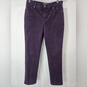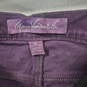 This product is a pair of Gloria Vanderbilt women's purple Amanda jeans in size 4P, designed specifically for petites. These straight-cut jeans feature a stylish and flattering fit, perfect for everyday wear. With a classic design and a pop of color, these jeans are versatile and can be dressed up or down for any occasion. Made by a trusted brand known for quality and comfort, these jeans are a chic addition to any woman's wardrobe. 27 inch inseam.