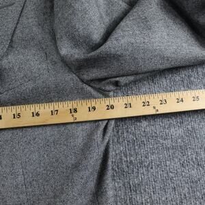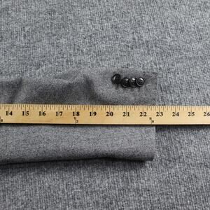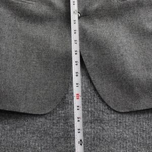 Features a classic gray weave, peak lapels, two-button front, jetted pockets, four-button cuffs, and full black lining