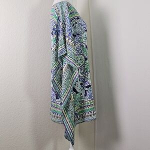 Add a pop of color to your wardrobe with this stunning Lilly Pulitzer poncho-style blouse. Crafted from 100% silk, this luxurious top features an exotic jungle and floral print in shades of green, navy, lavender, aqua, and coral. With a flowy silhouette and handkerchief hemline, it’s the perfect lightweight piece for beach vacations, resort lounging, or warm-weather chic.