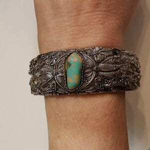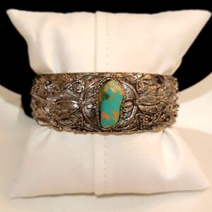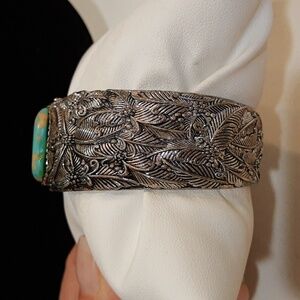 Vintage Carve Bangle Cuff Bracelet Silver tone turquoise stone adjustable