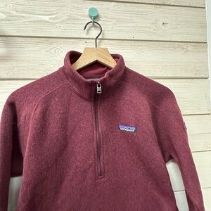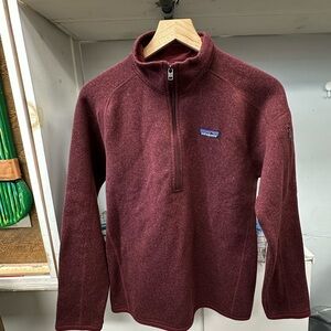 Stay warm and stylish with this Patagonia Better Sweater quarter-zip fleece pullover in a rich maroon color. Made from 100% recycled polyester, this cozy fleece features a zippered chest and sleeve pocket, soft brushed interior, and a classic fit that’s perfect for layering.