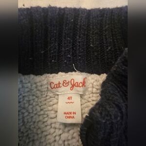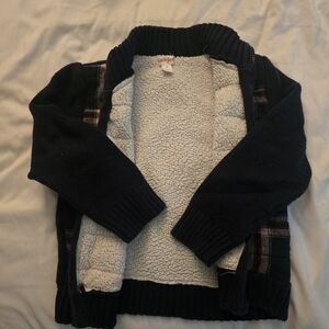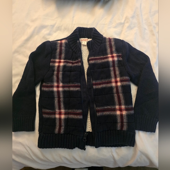 Cozy navy jacket with plaid pattern. Features a front zipper and ribbed details.