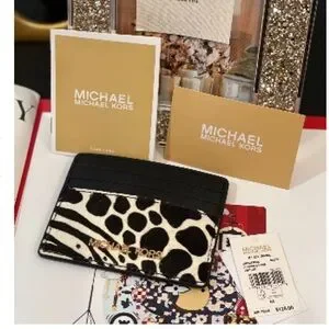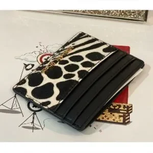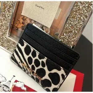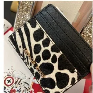 Chic card holder with bold black and white pattern. Gold logo multiple card slots for organization.