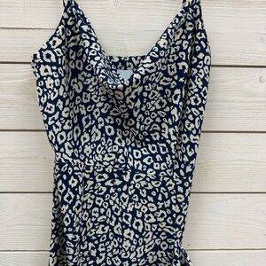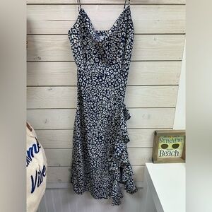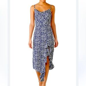 Flirty and feminine, this J.O.A. (Just One Answer) dress features a flattering cowl neckline, adjustable spaghetti straps, and a ruffle-trimmed asymmetrical front slit. The deep navy and white abstract print adds a playful twist to your summer style. Made of 100% polyester, it’s lightweight and flowy – perfect for brunch, beach dates, or summer parties.
