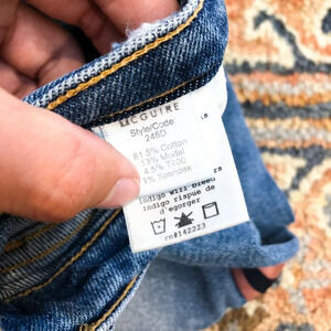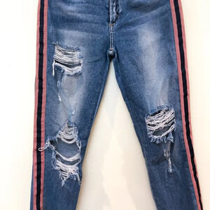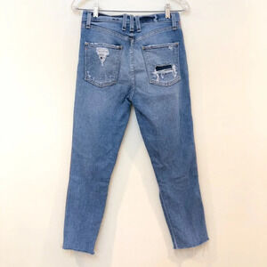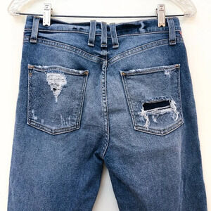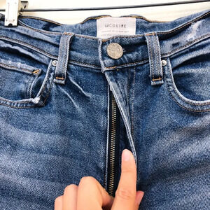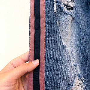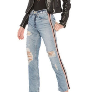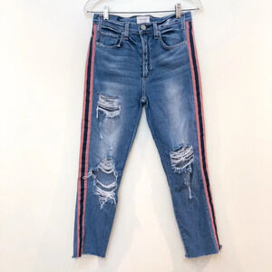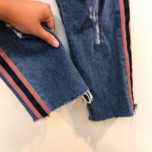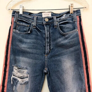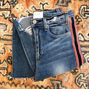 These gorgeous straight leg, slim jeans from McGuire have a pink and navy piping down the sides with distressing and a high rise! Preloved with some wear on the distressing, but otherwise in great condition!