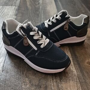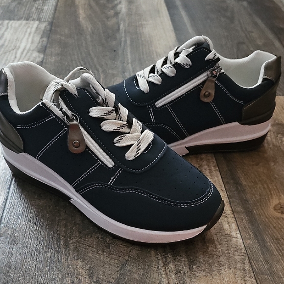 Elevate your workout with these navy and white athletic shoes. Designed for comfort and style, they are perfect for any active lifestyle.