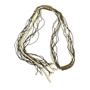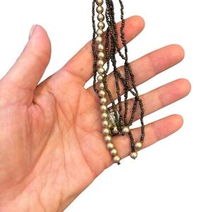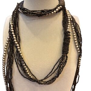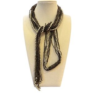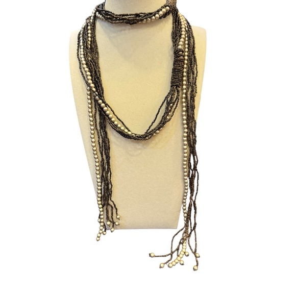 This elegant multi-strand necklace features a blend of earth tone brown and cream seed beads and faux pearls. This can be worn as a belt or a necklace. I love the fact that it’s serves different purposes. Drape around your neck loosely as you would a scarf, wear as a lariat style. Accentuate your figure and tie it around your waist loosely or tight.