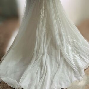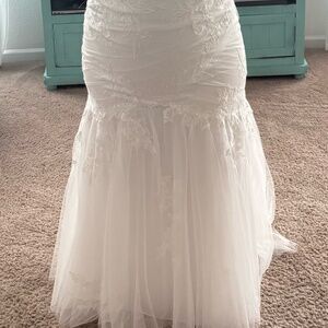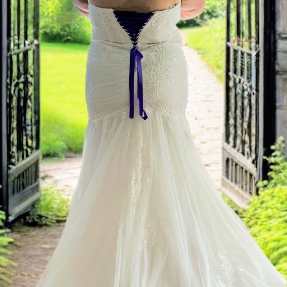 Due to having to cancel my upcoming wedding I’m no longer needing this dress however David’s Bridal has a no return policy worn twice the day I got it and the day for pictures had it steamed cleaned and been waiting for the big day it’s a beautiful mermaid gown the corset ribbon is interchangeable, just enough train very well fitting originally $499