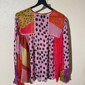 Chic blouse with bold polka dots. Features vibrant patchwork design. Ideal for a stylish statement.