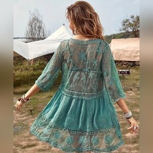 Step out in style with this elegant teal lace swim coverup. Perfect for beach days or poolside lounging, this coverup offers a chic and breezy look.