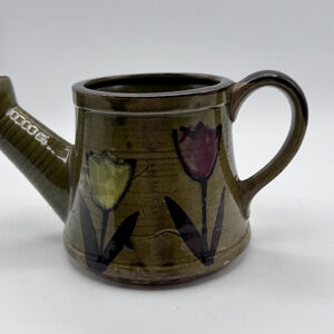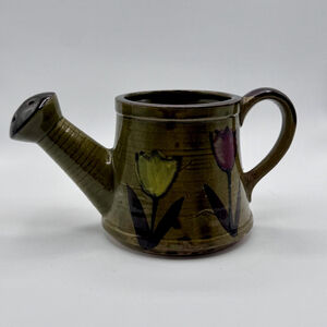 Charming vintage ceramic watering can planter, made in Japan for Nevco in the mid-to-late 1970s. Hand-painted with cheerful tulip motifs on an earthy olive-green glaze, this piece blends novelty charm with practical function. The spout is fully open, so it can be used as a small watering can or simply enjoyed as a decorative planter or vase.