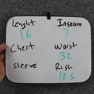 Measurements from photo board: Waist 32 in; Inseam 7 in; Rise 10.5 in; Outseam/length 16 in