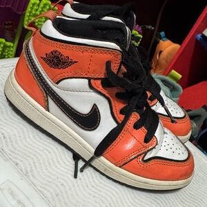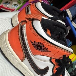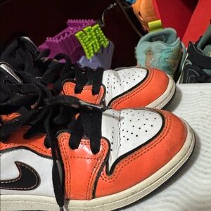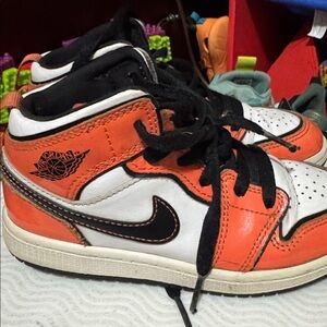 Vibrant Jordan sneakers for kids. Features bold orange, crisp white, and sleek black. Ideal for play and style.