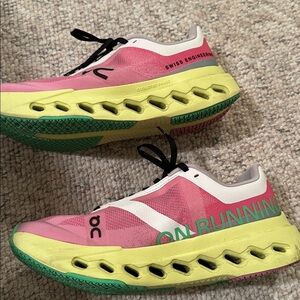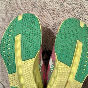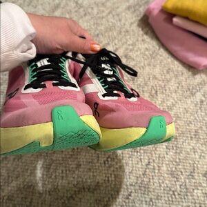Stylish pink sneakers with yellow accents. Features black laces and green details. Comfortable and trendy design.