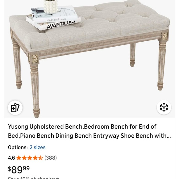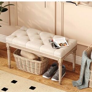 Stylish beige upholstered bench with wooden legs. Perfect for any room.
