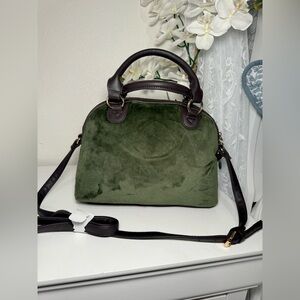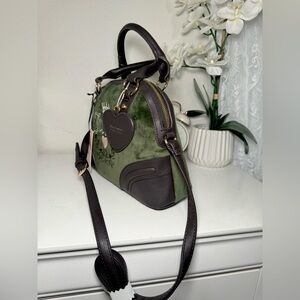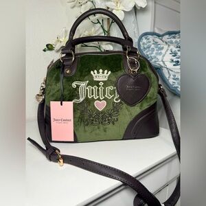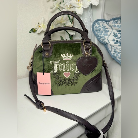 Stylish Juicy Couture satchel with olive green and dark brown design. Features heart charm and iconic logo. Perfect for any outfit.