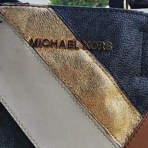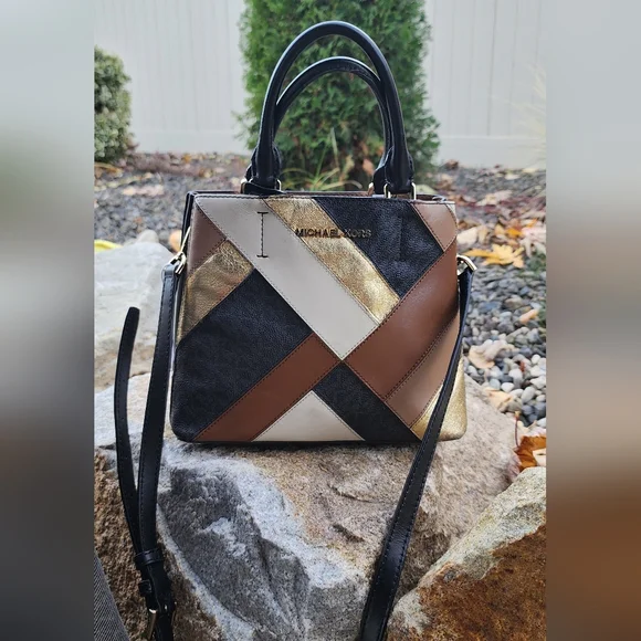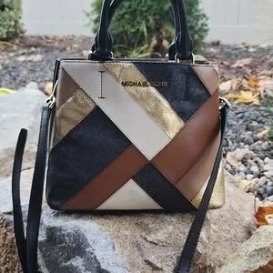 Chic satchel with a striking patchwork design. Features black, brown, and gold tones. Ideal for elevating your style.