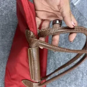 Style: Le Pliage tote bag in red nylon with brown leather flap and dual top handles.