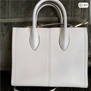 Chic Michael Kors satchel in cream. Features elegant handles and a sleek design. Perfect for everyday use.