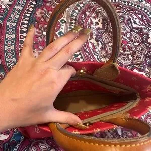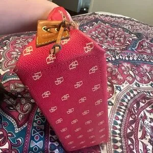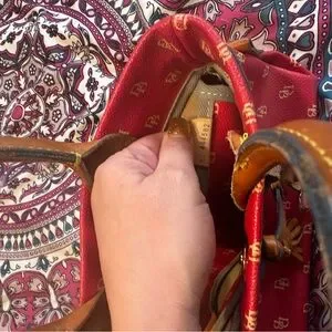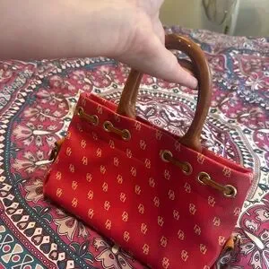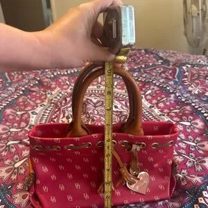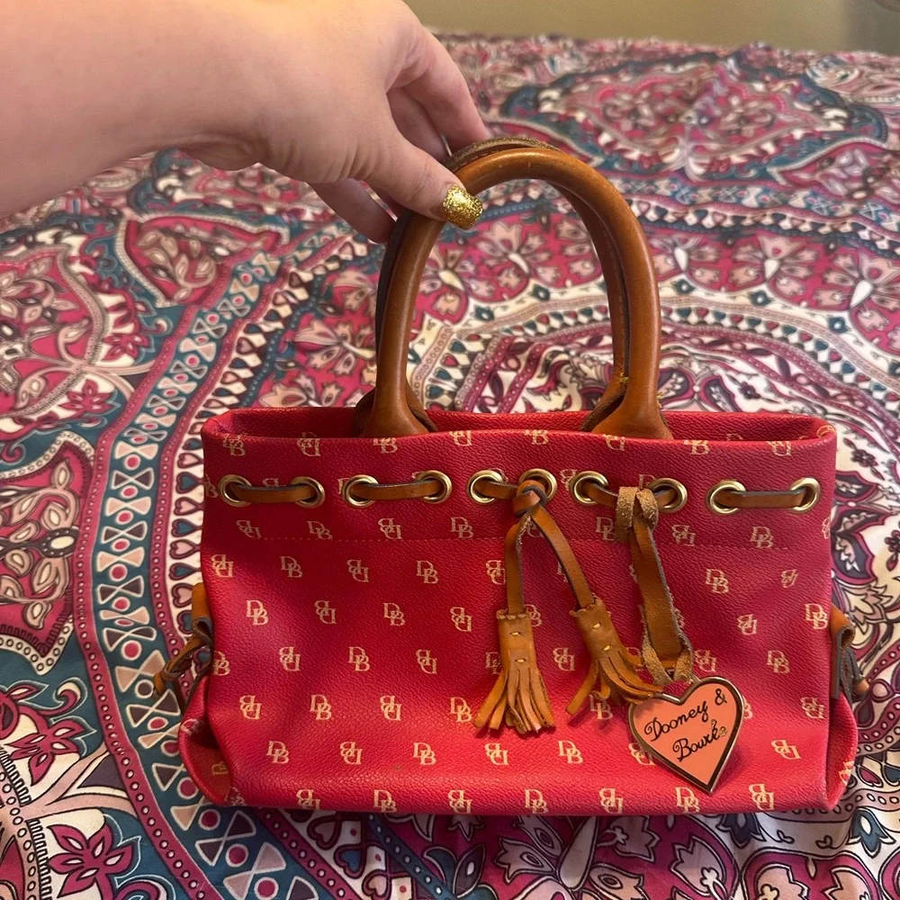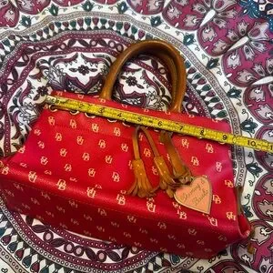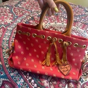 Stylish red satchel by Dooney & Bourke. Features tan leather handles and tassels. Iconic logo pattern adds elegance.