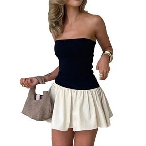 black and cream, strapless, mini dress, contrasting style, party outfit, skater dress, tube top, modern fashion, date night, chic aesthetic