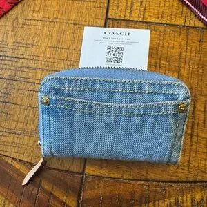 Stylish Coach denim coin purse with zipper closure. Features a classic design with a metallic logo accent.