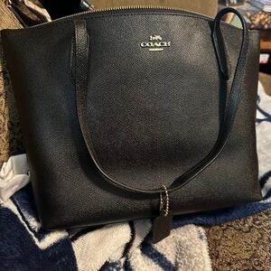 Sleek black leather tote with a textured finish. Features dual handles and a subtle logo accent. Perfect for daily use.