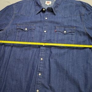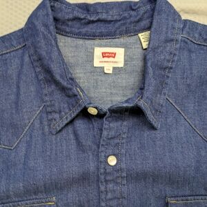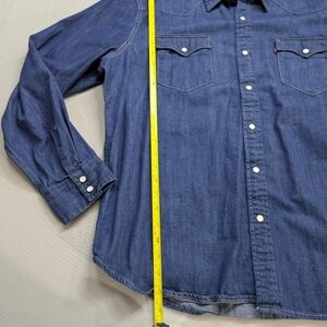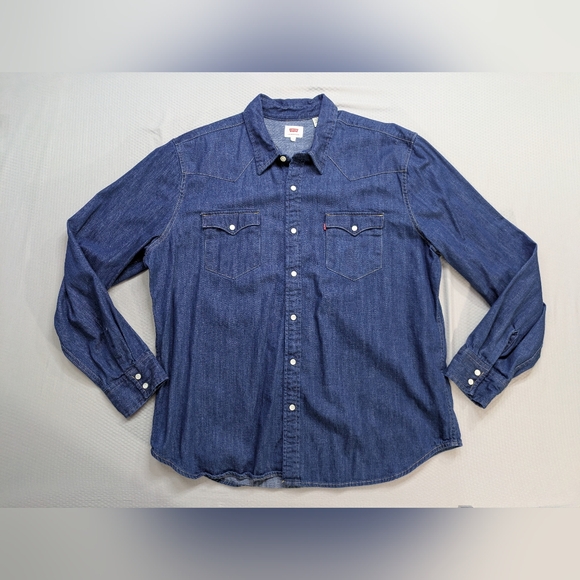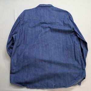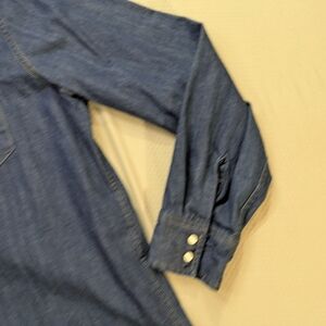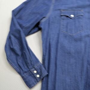 Classic blue denim shirt. Long sleeves with button cuffs. Two chest pockets with button closure. Perfect for casual wear.
