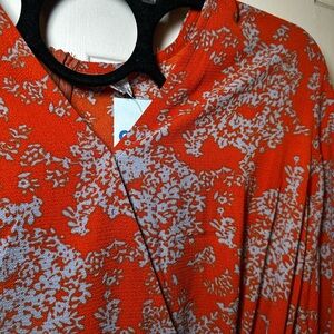 Chic long sleeve dress with a deep V-neck. Features a rust and lavender floral pattern. Stylish layered skirt with a tie waist.