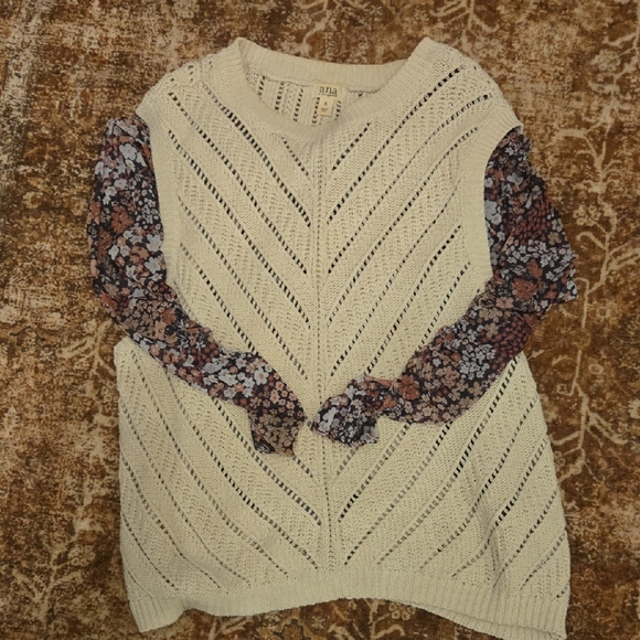 Elegant cream sweater with floral-patterned sleeves. Perfect for a stylish look.
