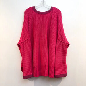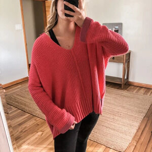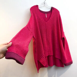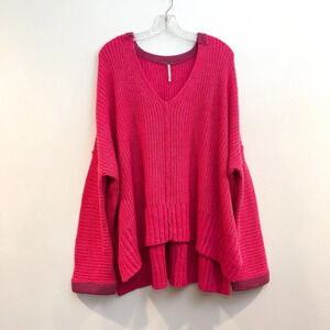 Free People Colorful Fun Pink Oversized Knit V Neck Wide Sleeve Pullover Sweater XS/S