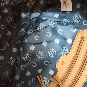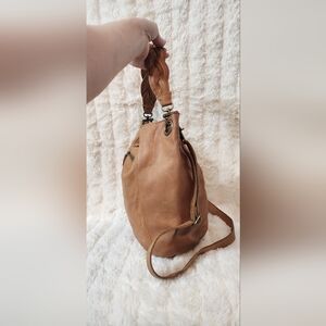 Chic tan leather hobo bag with braided handle. Features stylish buckle accents and studded details. Perfect for everyday use.