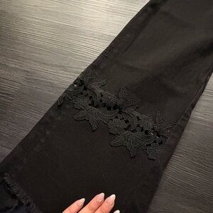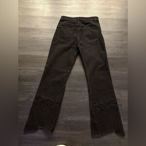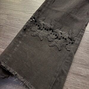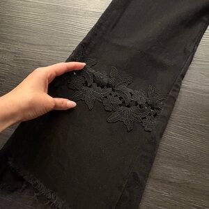 Gorgeous black flare jeans with intricate lace accents. Perfect for a stylish look.