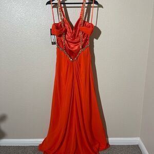 This stunning Faviana gown in a vibrant red hue is perfect for prom or a night out. Featuring a sleeveless design with delicate spaghetti straps and a sweetheart neckline, it offers a sophisticated and elegant look. The floor-length maxi style drapes beautifully, making it an ideal choice for any formal occasion.