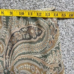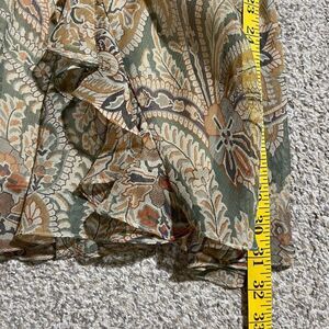 Chic paisley skirt with ruffle details. Features green and brown tones. Ideal for a fashionable look.