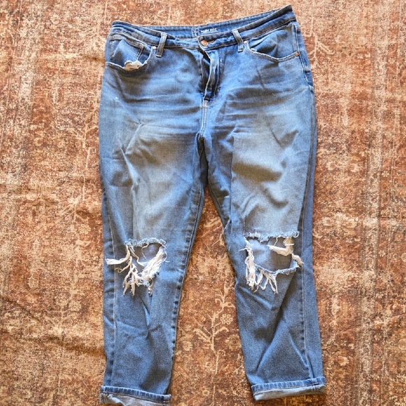 Trendy light blue boyfriend jeans with stylish distressing. Perfect for casual outings. Comfortable fit. size 15 but fits like size 12.