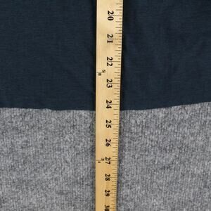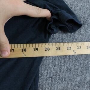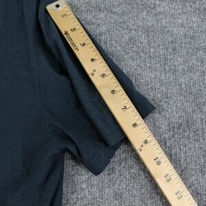 Details: Soft lightweight knit fabric, Vuori logo patch at lower hem with yellow and blue stripe design, inner tag with extra button attached and text "HERE'S AN EXTRA BUTTON JUST IN CASE," interior hem tag with slogan "Move and Be Moved."