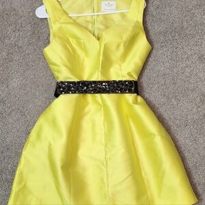 Vibrant yellow dress. Features a stylish black belt. Sleeveless design. Perfect for any occasion.
