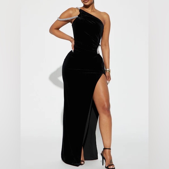 Turn heads with this stunning black one-shoulder evening dress. Perfect for any formal occasion, this dress features a sleek design and a daring slit for added elegance.
