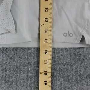 Details: Elastic waistband with internal drawstring, on-seam hand pockets, lightweight breathable mesh fabric, solid panels at the lower legs, small side vents at the hem, and tonal alo logo at the front left leg.